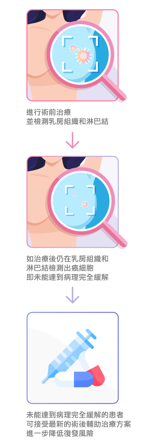 病理學家會檢測透過手術切除的乳房組織和淋巴結,評估術前治療的成效。如沒有在乳房組織和淋巴結檢測出癌細胞,代表早期治療有效,此現象稱為病理完全緩解(pCR; pathological complete response)。有數據顯示,達到病理完全緩解的患者的相對死亡風險較低。(3)對於不能達到病理完全緩解的患者,亦可接受最新的術後輔助治療方案,進一步降低復發風險。(4)
