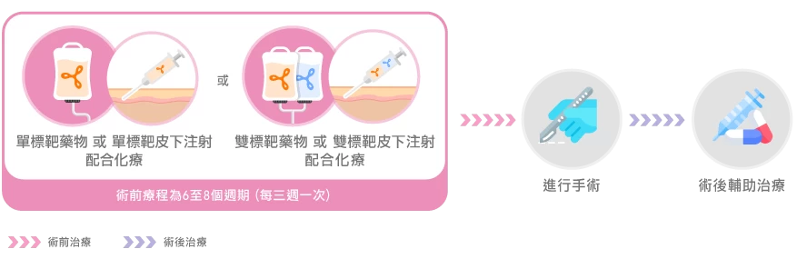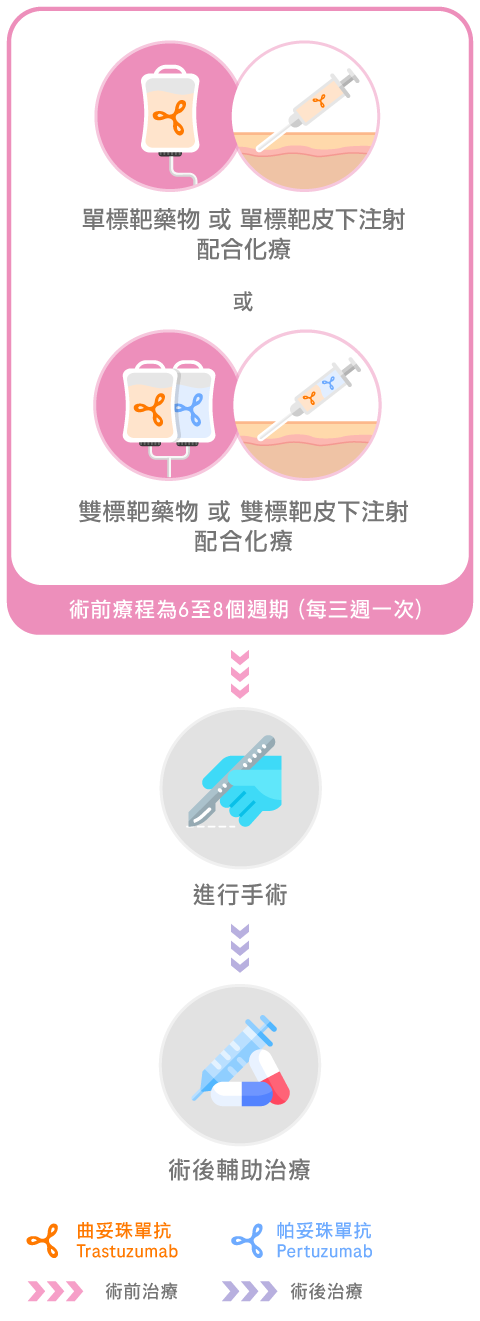 以往,針對早期 HER2 型乳癌的術前藥物治療主要為曲妥珠單抗及化療的單標靶藥物組合。近年美國National Comprehensive Cancer Network (NCCN) 指引,以及歐洲European Society for Medical Oncology (ESMO) 發行的治療指引均建議,部分患者(例如腫瘤較大,或有淋巴擴散的患者)可考慮在單標靶藥物組合上再加上帕妥珠單抗成為雙標靶藥物組合,以助提高達到病理完全緩解的機會。(4,6) 如妳和妳的醫生認為您適合接受術前治療,妳可在手術前接受標靶藥物加化療的組合。通常術前治療的療程為6至8個週期(每三週一次);妳將於手術後繼續接受抗HER2標靶藥物的術後輔助治療(手術前和後的抗HER2標靶藥物治療需合共達一年)。