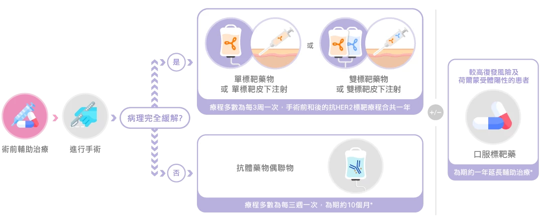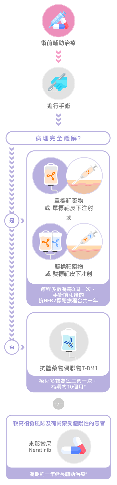 對於已接受術前輔助治療及成功達到病理完全緩解的早期 HER2 型乳癌患者,可繼續接受包含單或雙標靶的術後輔助治療(手術前和後的抗HER2標靶藥物治療需合共達一年)。若果患者不能達到病理完全緩解,可接受抗體-藥物偶聯物 為期約10個月的術後輔助療程 。