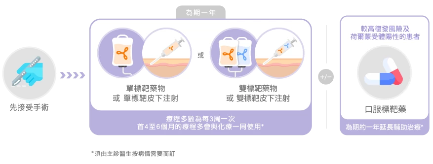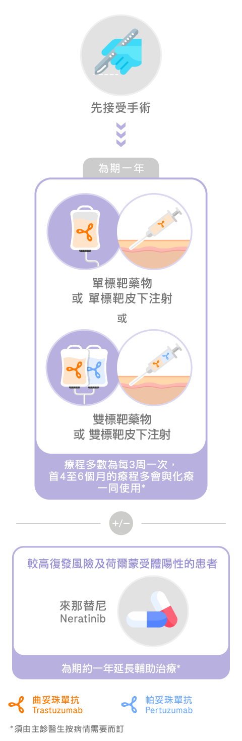 不論妳有否接受術前治療,美國National Comprehensive Cancer Network(NCCN)指引以及歐洲European Society for Medical Oncology (ESMO) 的指引均建議早期 HER2 型乳癌患者須接受合共一年的曲妥珠單抗(trastuzumab)輔助治療。部分較高復發風險的患者(如出現有淋巴擴散或其他高危因素),可考慮在單標靶藥物組合上再加上帕妥珠單抗(pertuzumab)成為雙標靶藥物組合,以進一步降低乳癌復發風險。療程多數為每 3 周一次,首 4 至 6 個月的療程多會與化療一同使用;由主診醫生按病情需要而訂。(2,4,6)