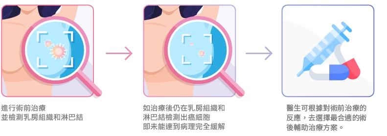 病理學家會檢測透過手術切除的乳房組織和淋巴結,評估術前治療的成效。如沒有在乳房組織和淋巴結檢測出癌細胞,代表術前治療有效,此現象稱為病理完全緩解(pCR; pathological complete response)。對於不能達到病理完全緩解的患者,醫生可根據對術前治療的反應,去選擇最合適的術後輔助治療方案。(3,4)